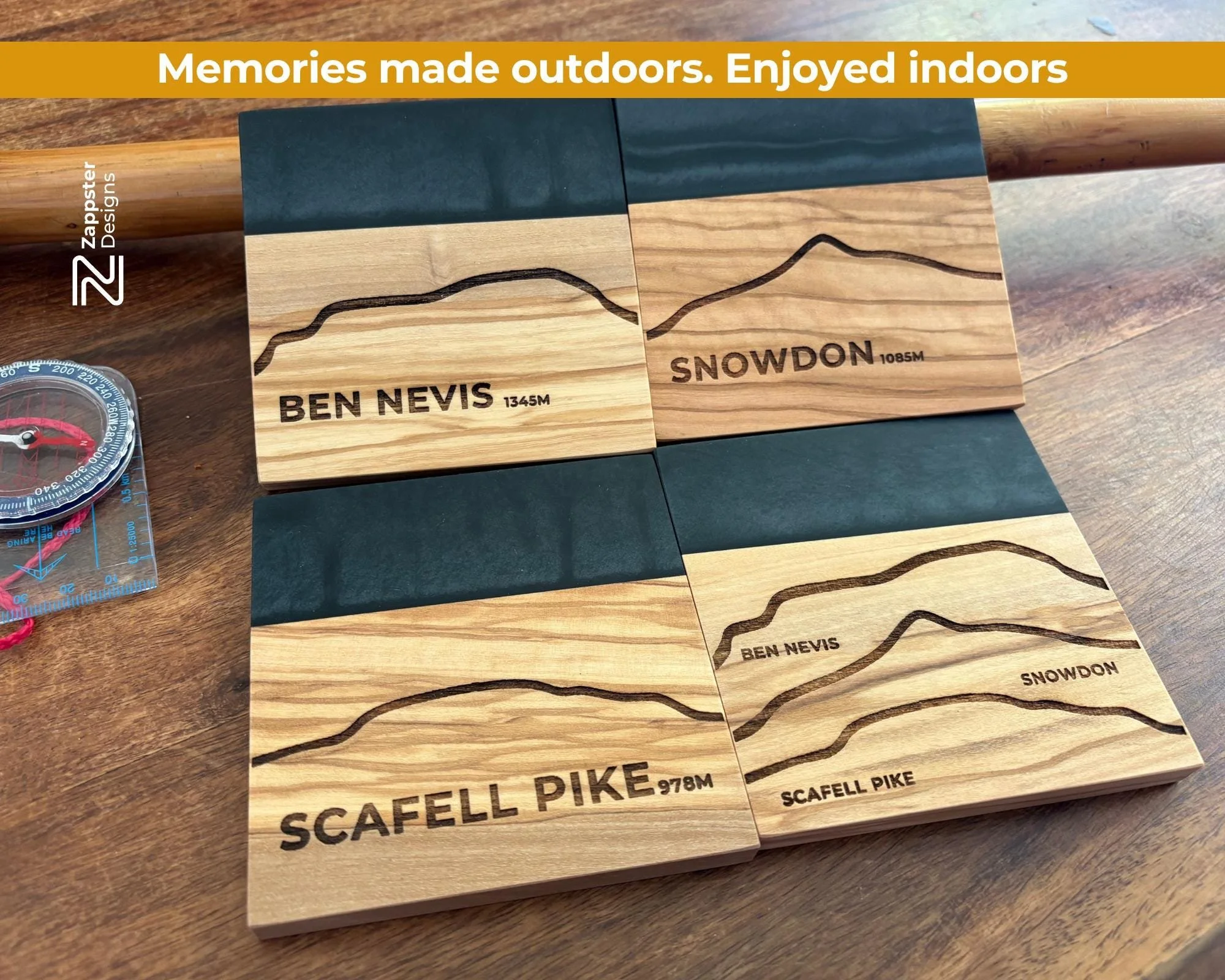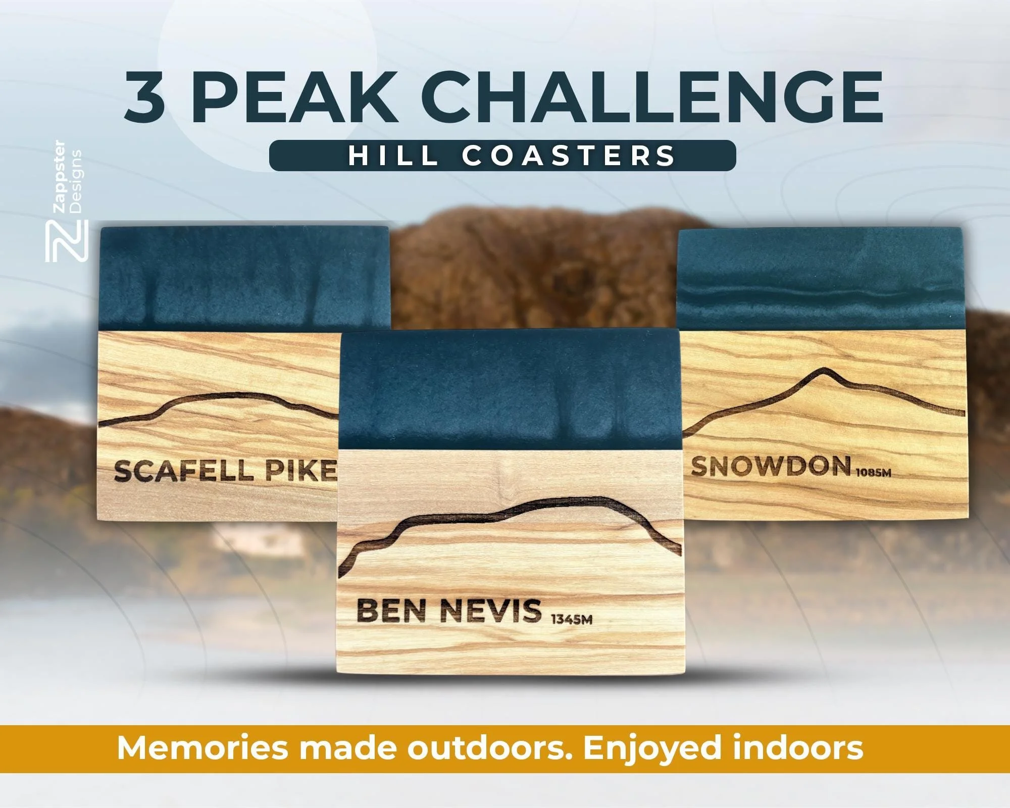 ๐๏ธ 3 Peak Challenge โ Olive Wood & Resin Coaster Set (Special Edition of 4) Celebrate your 3 Peak Challenge with this handcrafted set of 4 olive wood and resin coasters, specially designed for hillwalkers, adventurers, and lovers of the great outdoors.