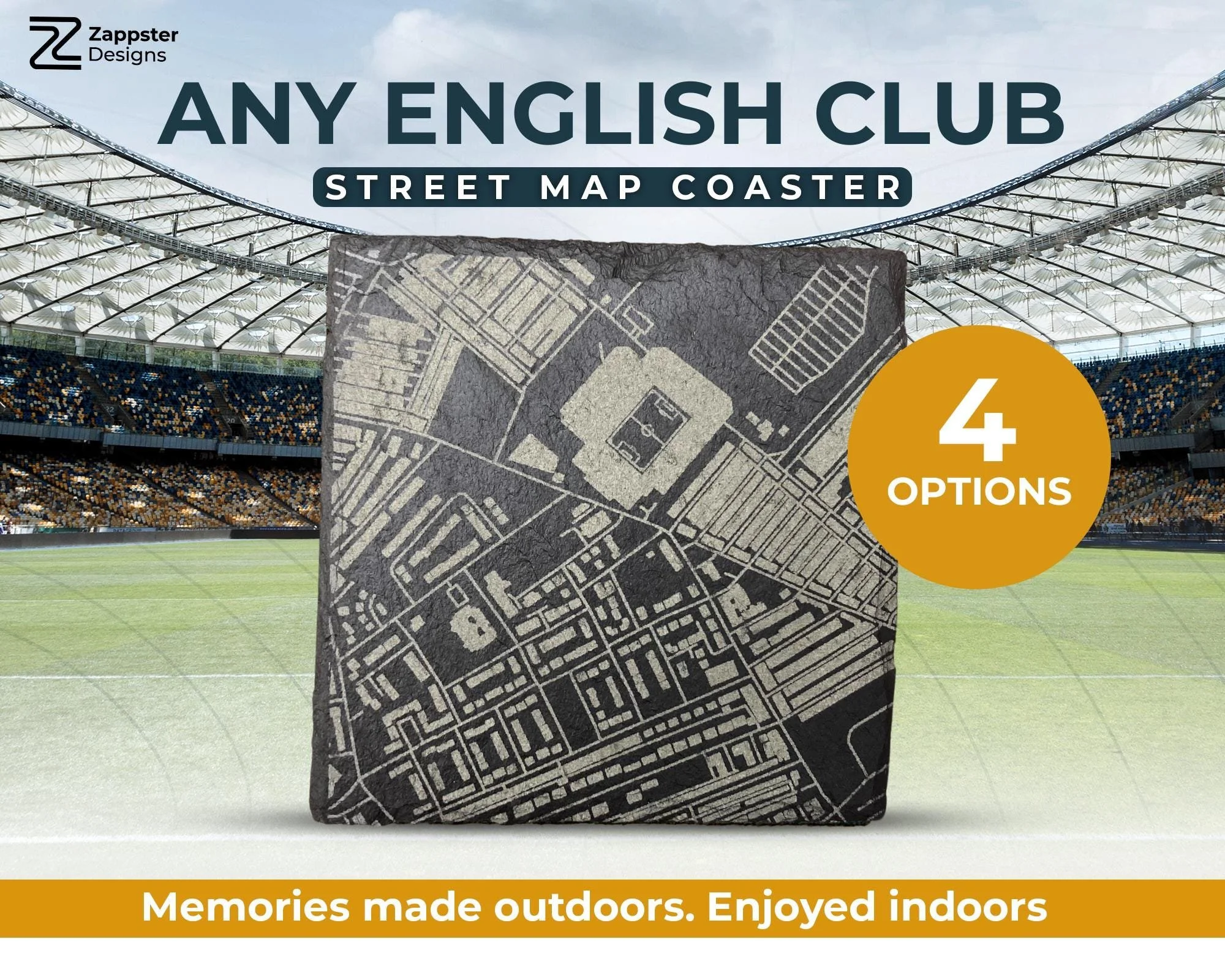 Any English football stadium map on a slate coaster - fully customisable with a memorable football score or keep it simple with the name of the stadium and its capacity.