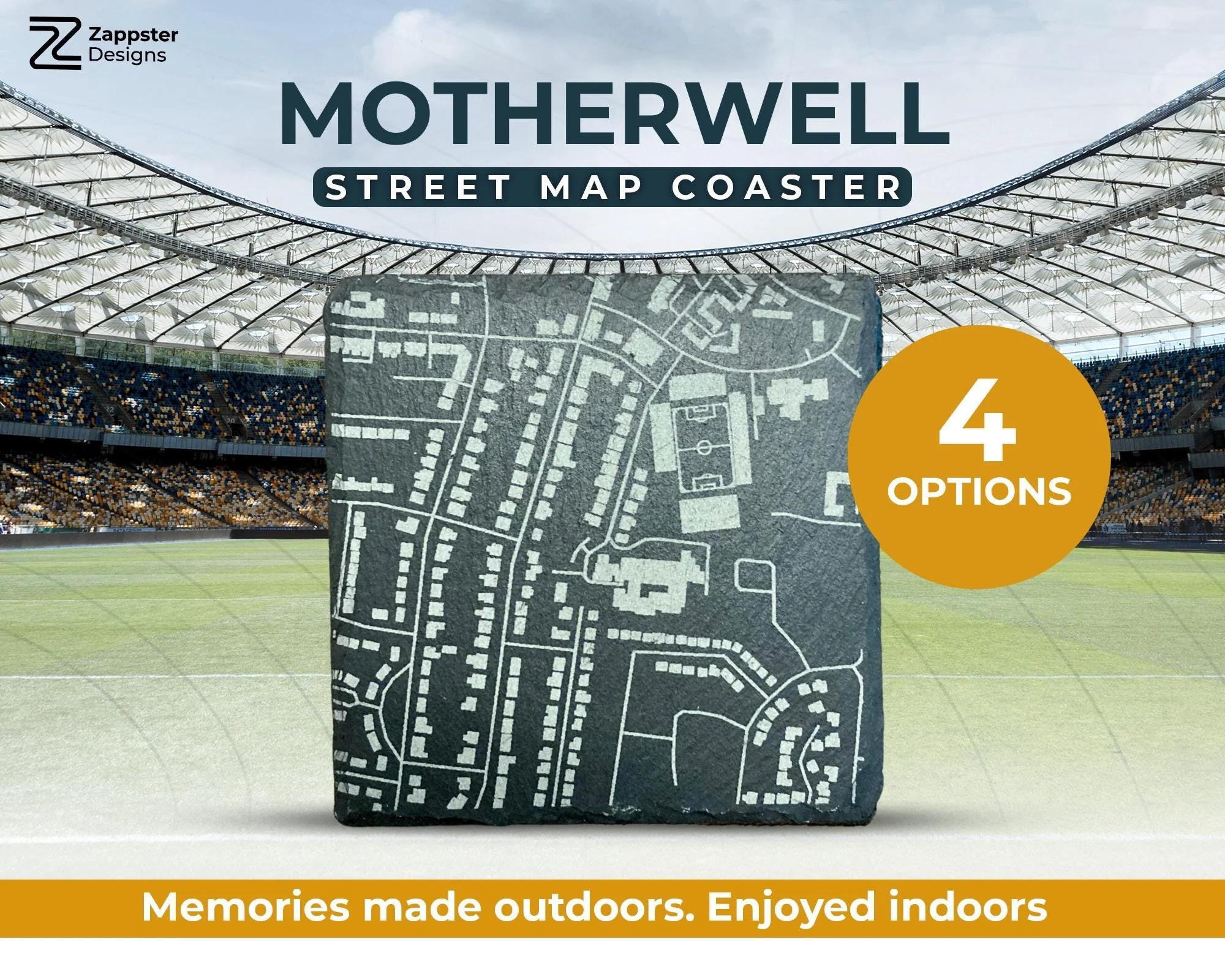 Motherwell football stadium map on a slate coaster - fully customisable with a memorable football score or keep it simple with the name of the stadium and its capacity.