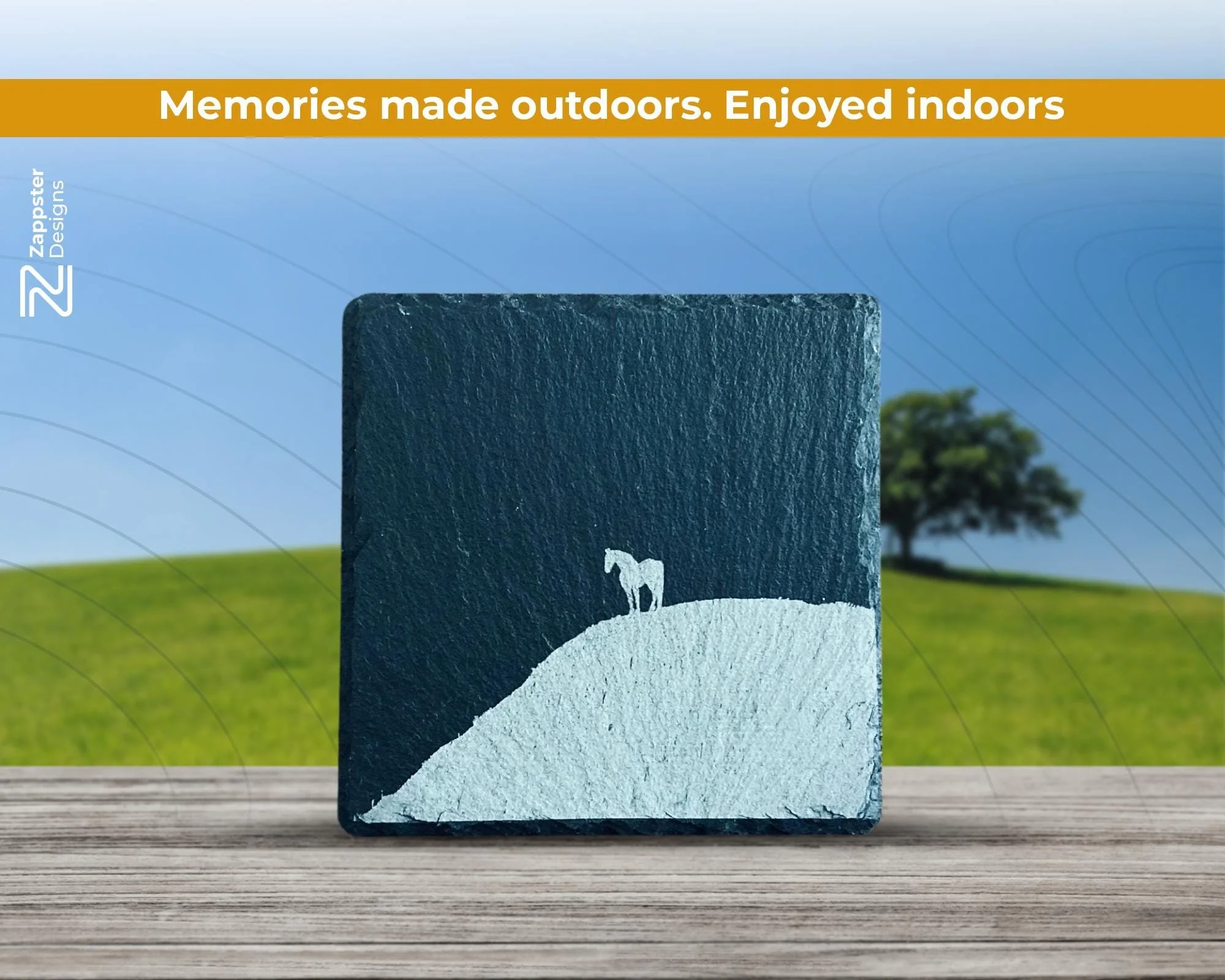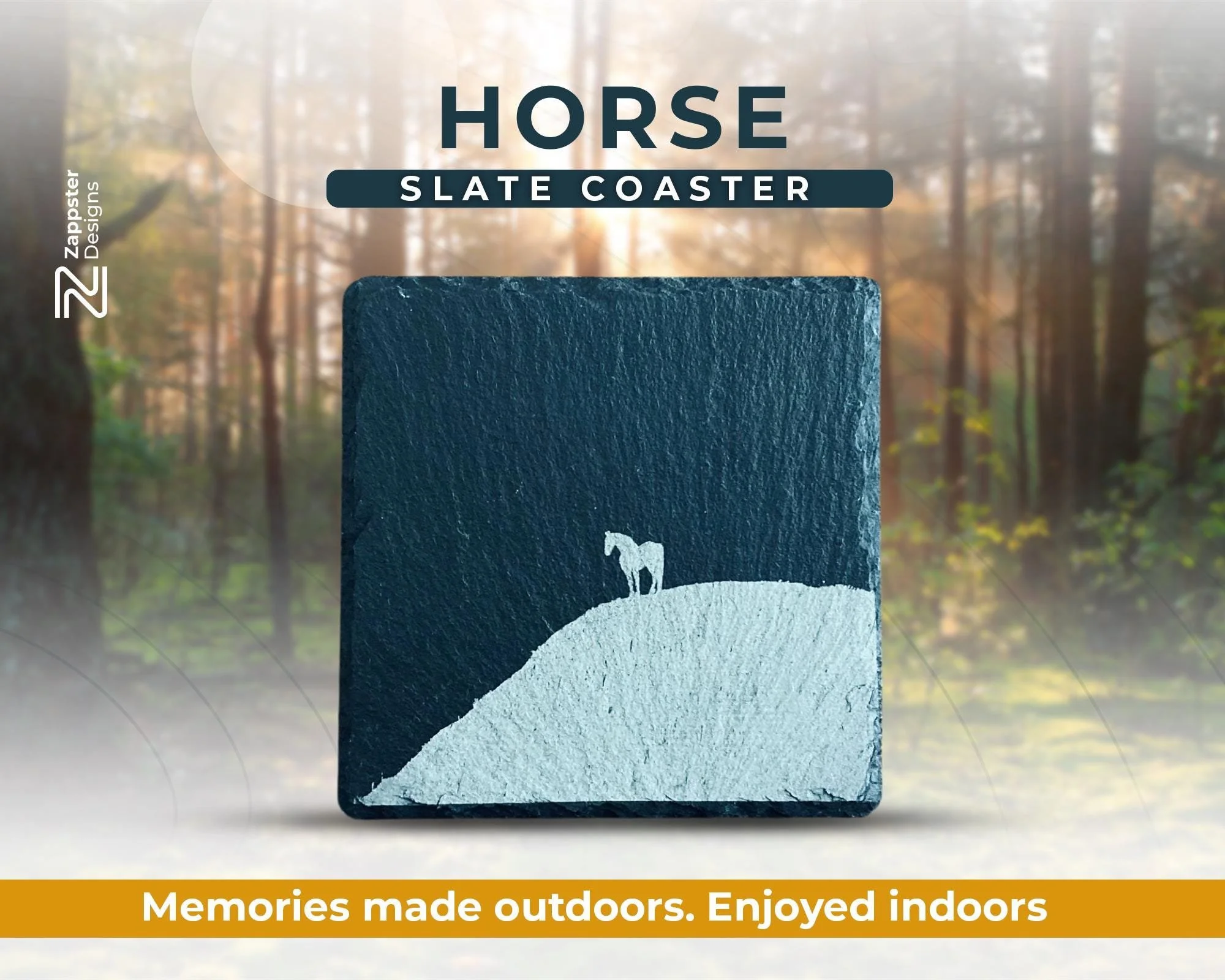 Add Rustic Elegance with Our Handcrafted Slate Coaster – Featuring a Horse Silhouette on a Hillside