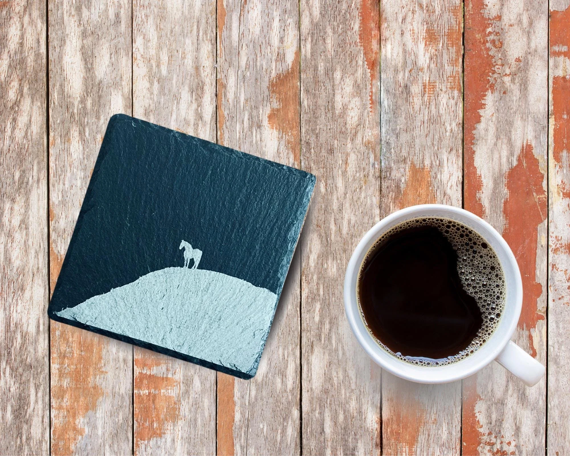 Celebrate the beauty of nature and timeless design with this handcrafted slate coaster, showcasing the striking silhouette of a horse on a hillside. Perfect for equestrian lovers and those who appreciate understated elegance.
