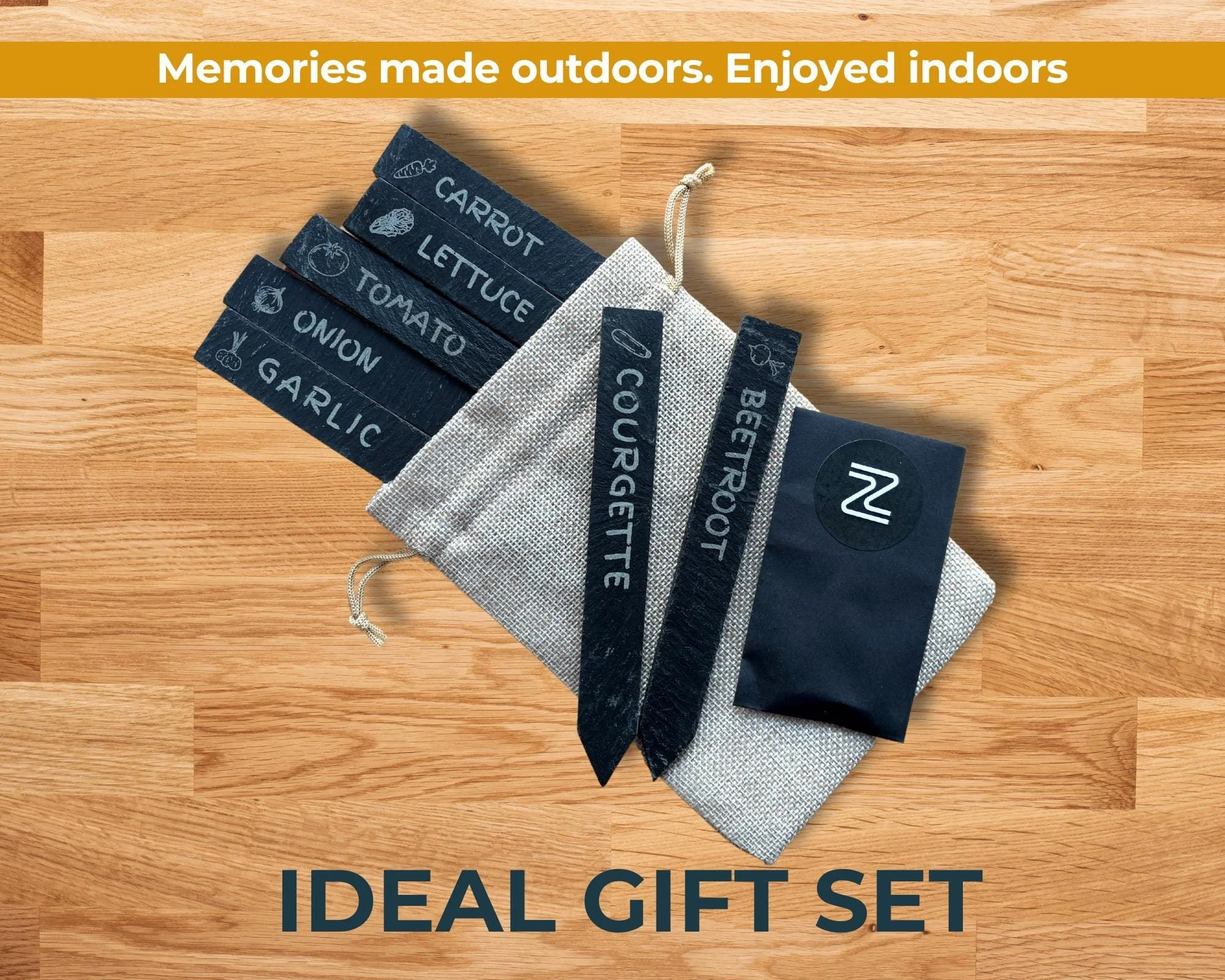 What's Included Your chosen quantity of slate markers, each engraved with a vegetable or plant name of your choice A seed selection A hessian bag