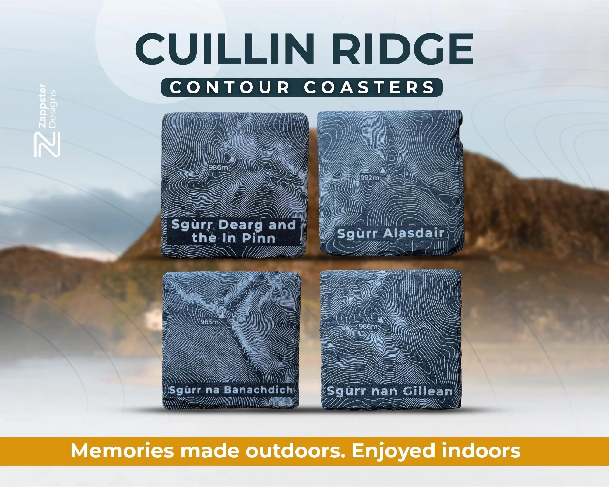 Personalised Isle of Skye Coaster Set – Cuillin Ridge Hill Contours, Munro Gift