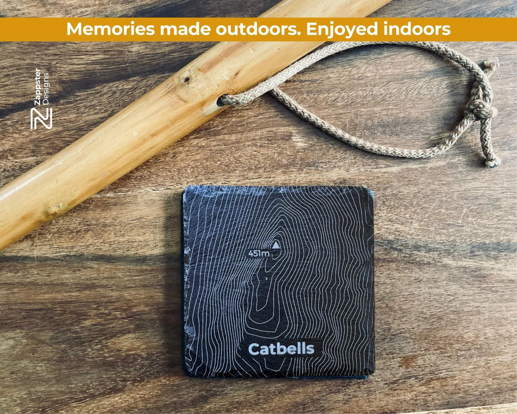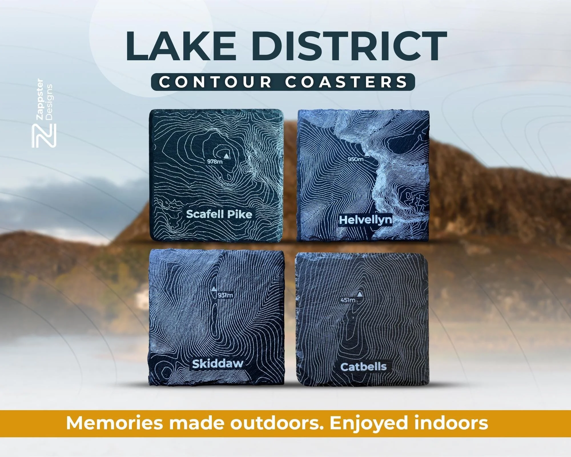 What's included Four slate coasters, each engraved with a different Lake District hill contour: Scafell Pike, Helvellyn, Skiddaw and Catbells. Each coaster includes the hill name engraved beneath the contour.