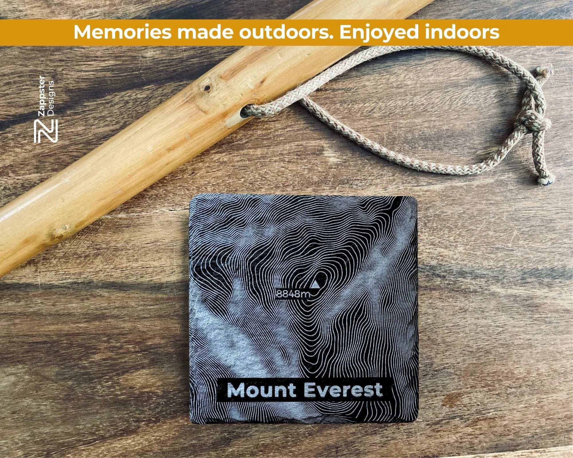 This personalised Mount Everest coaster captures the contour of the world's most iconic peak — laser engraved onto natural slate and finished by hand in our West Lothian workshop. Whether it's a dream on the list, a trek to Base Camp already completed, or simply a mountain that means something, this coaster carries that connection into everyday life.