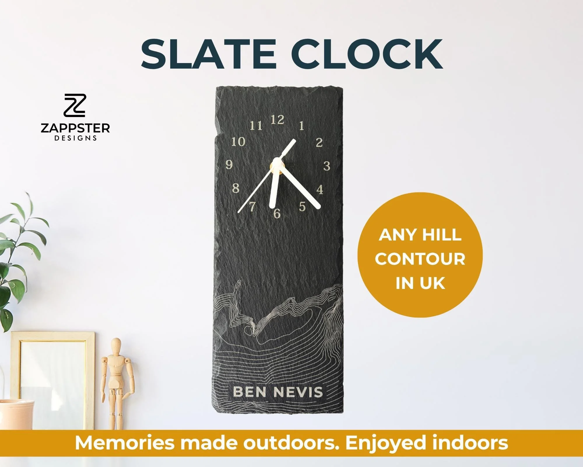 Product details: - Slate size: 30cm tall x 12cm wide (approx.) - Laser engraved with your chosen hill's contour lines - Custom text included (hill name) - Fitted with high-quality clock hands and silent quartz movement - Requires 1x AA battery (included) - Suitable for indoor use only