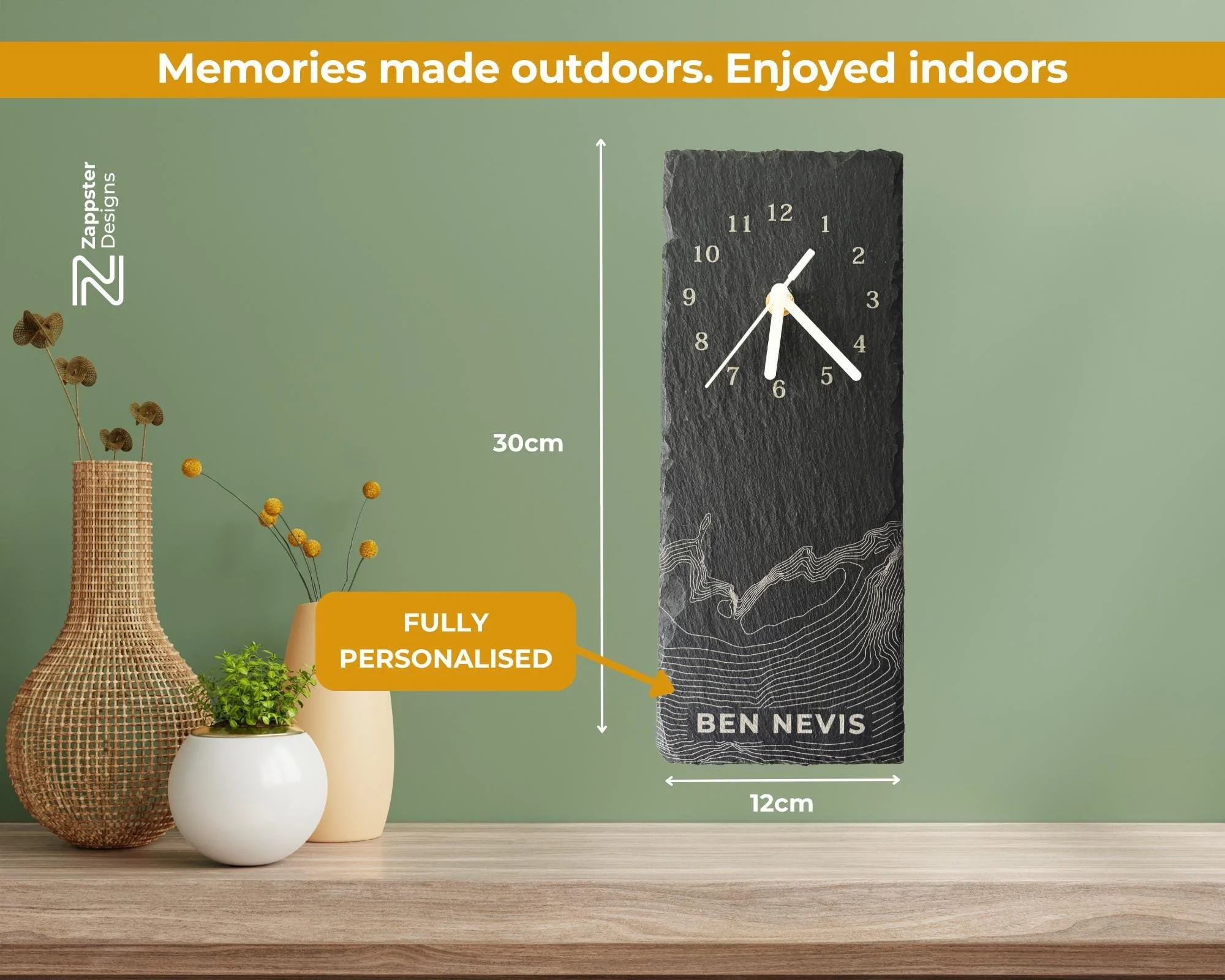 Each clock is crafted from natural slate and laser engraved to reveal the unique shape and story of the landscape. It’s ideal as a meaningful gift for walkers, climbers, or anyone with a personal connection to the outdoors.