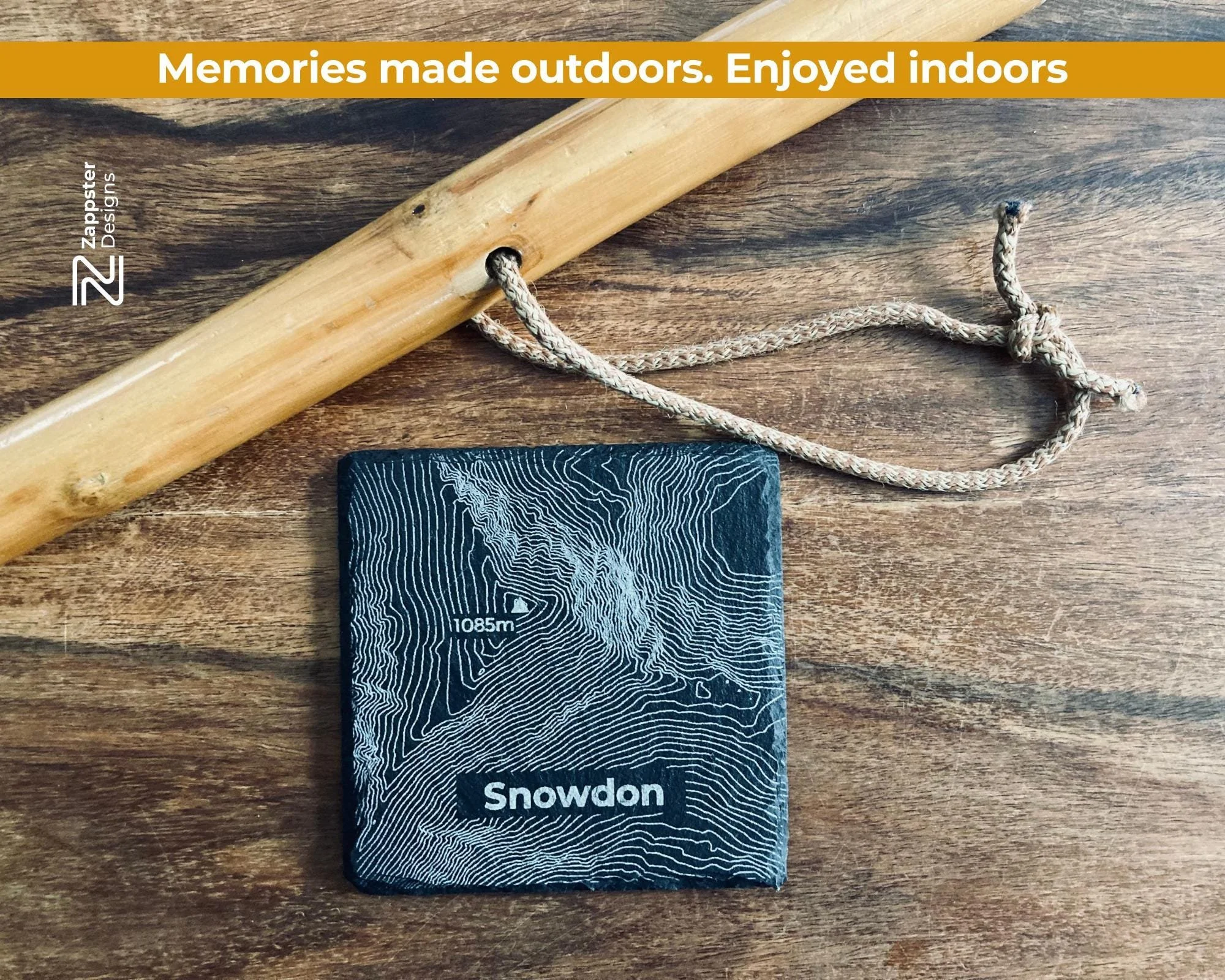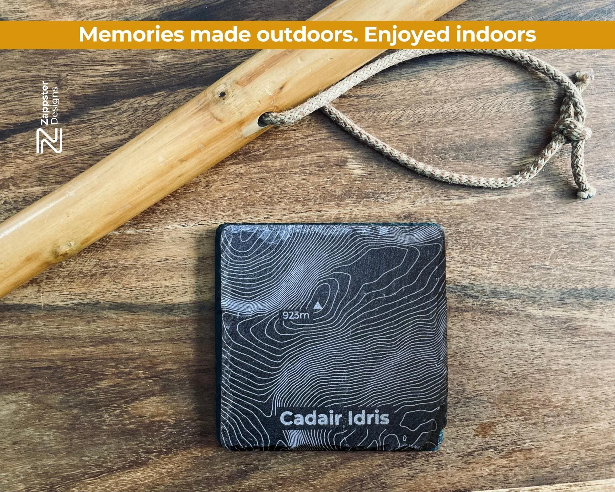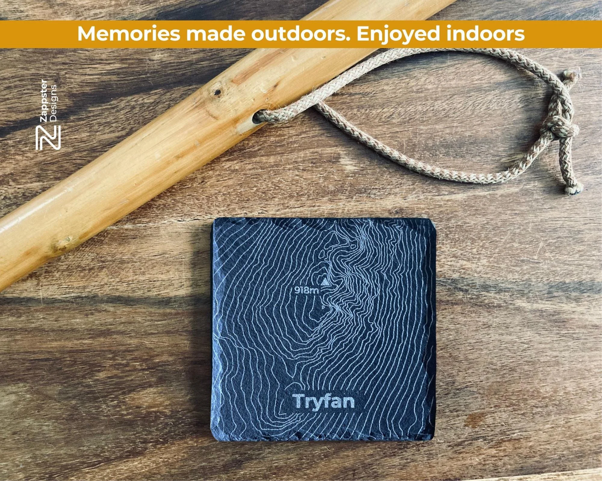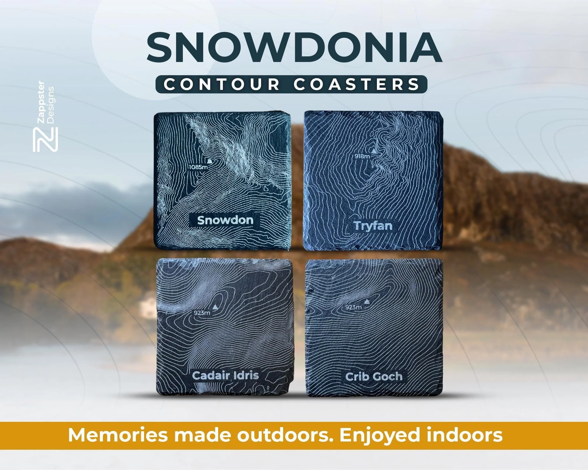 What's included Four slate coasters, each engraved with a different Snowdonia hill contour: Snowdon, Tryfan, Cadair Idris and Crib Goch. The hill name is engraved beneath each contour.