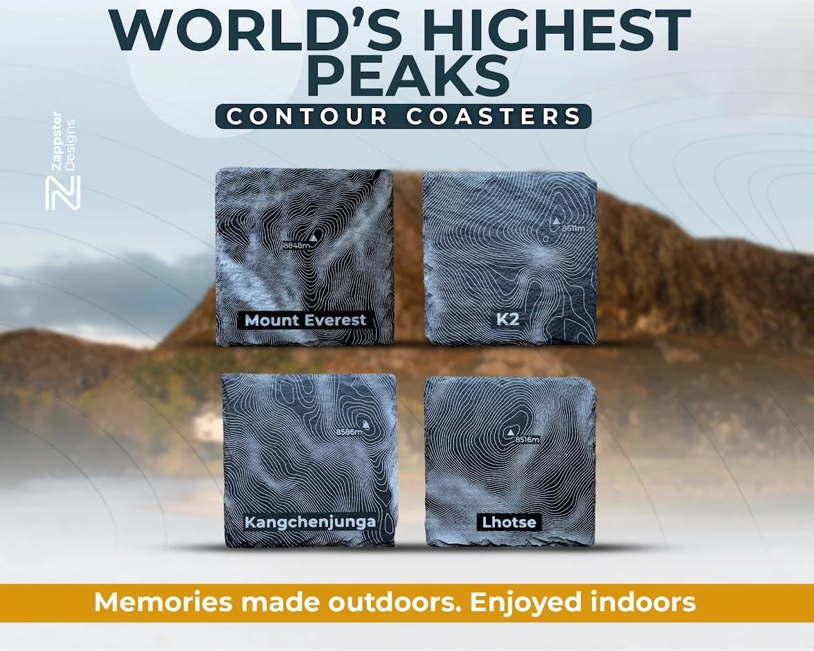World's 4 Highest Peaks Contour Slate Coaster Set – Everest K2 Kangchenjunga Lhotse Mountain Gift