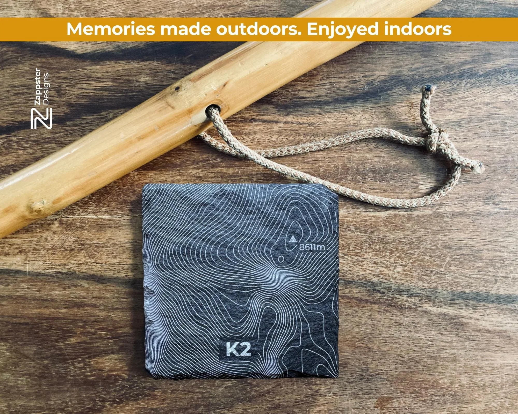 - Four slate coasters, each engraved with a world peak contour and name: